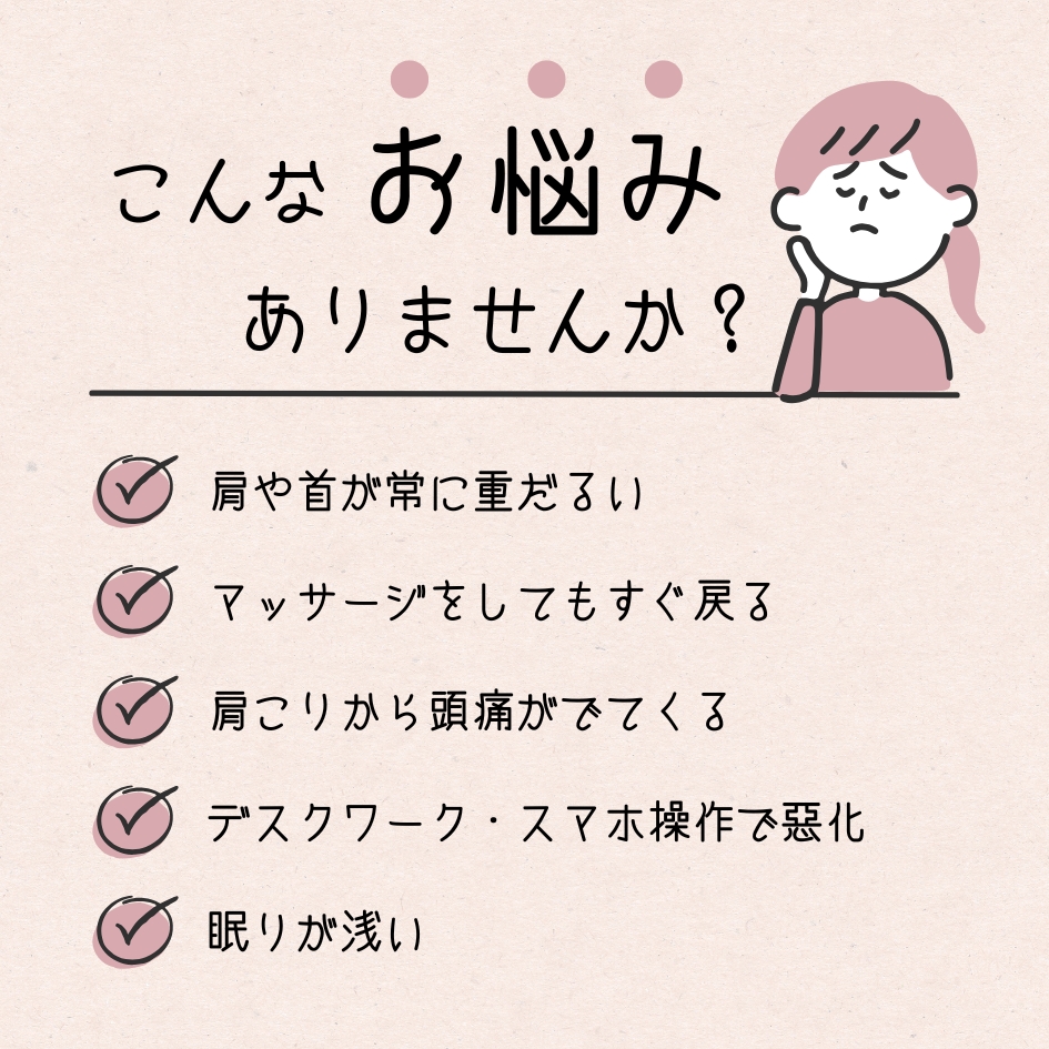 肩こりとは、首~肩周囲の筋肉が緊張し続けることで血流が悪くなり、重だるさ・痛み・不快感が出ている状態を指します。デスクワークやスマホ操作、姿勢の崩れ、ストレスなどが重なり、自覚がないまま慢性化している方も少なくありません。